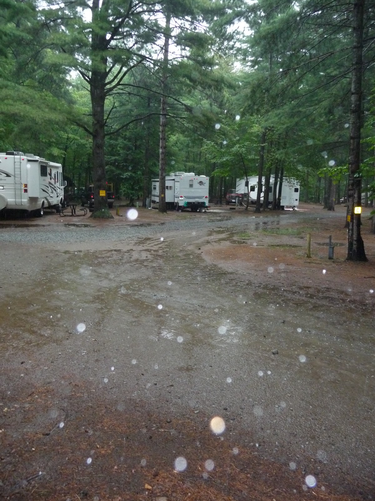 We spent the weekend at the KOA in Lake Placid. It went so quick! Of course today wasn't much fun. We knew we'd be packing in the rain. We are pretty much only getting rain from the Tropical Storm Miss Irene, formerly a Hurricane. Thankfully we are so far north that most of the wind missed us as well. However, it did make for a quick pack job. Poor Hubby was SOAKED! As he attempted to dry off in the truck on the way back home he mused....how could we have done this quicker or better so I didn't get totally wet! And, I said, well, we could have at least an extra shirt for you in the truck...at which point, he said, well, I didn't PACK for Irene! I only had enough clothes left for today!