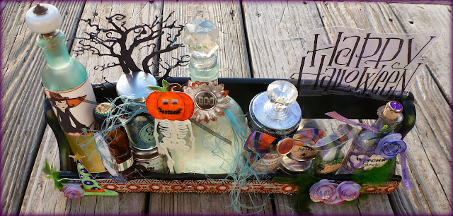 Here is a top view of my bottles, tree, and Mr. Pumpkin Head.